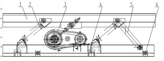 1輸送槽、2主振彈簧、3驅動連桿機構、4底座、5導向桿、6輔助支座。